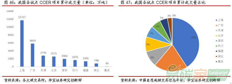 上海、廣東CCER累計(jì)成交量領(lǐng)先,占比超60%。截至2021年4月23日,中國碳市場CCER累計(jì)成交2.87億噸,上海、廣東CCER成交量領(lǐng)先,上海市場累計(jì)成交量1.17億噸,占全國累計(jì)成交量的41%,廣東市場累計(jì)成交量5814萬噸,占比20%左右,北京、天津累計(jì)成交量均在2500萬噸左右,占比分別為9%左右,深圳、四川、附件見累計(jì)成交量位于1300-2000萬噸之間,占比約為5%-7%,湖北、重慶成交量較低,占比不足5%。
