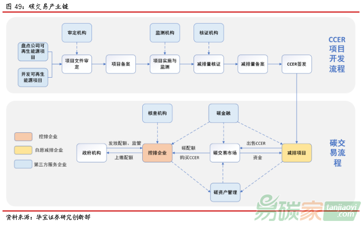碳交易市場相關(guān)產(chǎn)業(yè)鏈主要分為碳抵消、碳控排與碳服務(wù)三大板塊。1)碳抵消即自愿減排市場,一般流程為自愿減排企業(yè)開發(fā)可再生能源或節(jié)能減排項(xiàng)目,并經(jīng)過政府規(guī)定的項(xiàng)目審定、項(xiàng)目備案、實(shí)施與監(jiān)測、減排量核證、減排量備案一系列流程,最終獲得核證的自愿減排量,可在碳市場進(jìn)行交易。自愿減排企業(yè)包括可再生能源行業(yè)企業(yè)、擁有減排技術(shù)的高新企業(yè)、擁有森林等生態(tài)資產(chǎn)的企業(yè)。2)碳控排即碳配額總量控制與交易市場,主要指控排企業(yè)按時(shí)履約、交易碳資產(chǎn)、減少碳排放的過程,控排企業(yè)為被納入碳交易市場、擁有碳配額的高排放企業(yè),按中國碳市場規(guī)劃主要為電力、鋼鐵、石化、化工、建材、有色金屬、造紙和國內(nèi)民用航空行業(yè)的高排放企業(yè)。3)碳服務(wù)指圍繞碳交易所有第三方服務(wù),包括為政府或企業(yè)提供包括碳核查、碳資產(chǎn)管理(碳盤查、CCER項(xiàng)目開發(fā)、碳報(bào)告、碳配額使用規(guī)劃、減排路徑咨詢、配額交易服務(wù)等)、綠色認(rèn)證、碳金融、平臺或軟件建設(shè)等服務(wù)的相關(guān)企業(yè)。