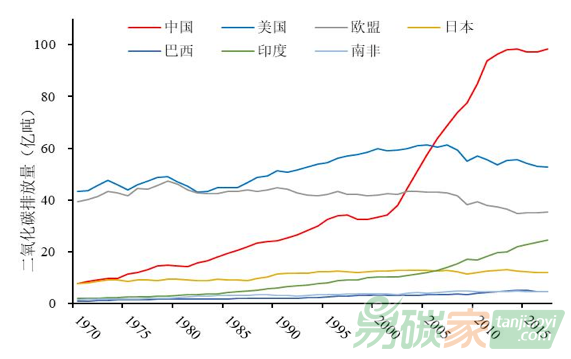 圖1 世界主要國家二氧化碳排放總量圖(數(shù)據(jù)來源:GCP)