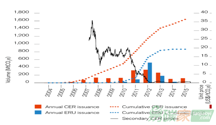 因哥本哈根會議結果的不理想及歐盟第三階段對CER使用的限定,CER價格在2010年中旬便開始了瀑布式下跌,價格從之前的20美元一噸跌倒不到2012年的不到1美元一噸,跌去了90%,基本等于歸零。