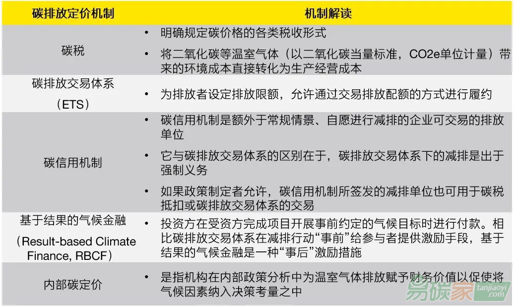 根據(jù)世界銀行《碳定價機(jī)制發(fā)展現(xiàn)狀與未來趨勢 2020》,目前全球碳排放定價機(jī)制主要包括以下五種,其中碳稅和碳排放交易體系(Emission Trade System,ETS)是最為主要的兩種。