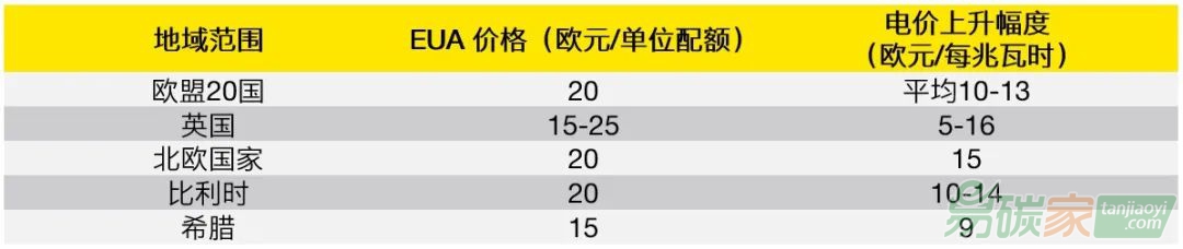 作為電力行業(yè)的企業(yè)成本,歐洲碳排放配額的價格會傳導(dǎo)至電力價格。趙盟等(2012)在《EU ETS對歐洲電力行業(yè)的影響以及對我國的建議》中對歐洲主要經(jīng)濟(jì)體電力價格受到歐洲碳排配額價格影響進(jìn)行了分析,如下表所示: