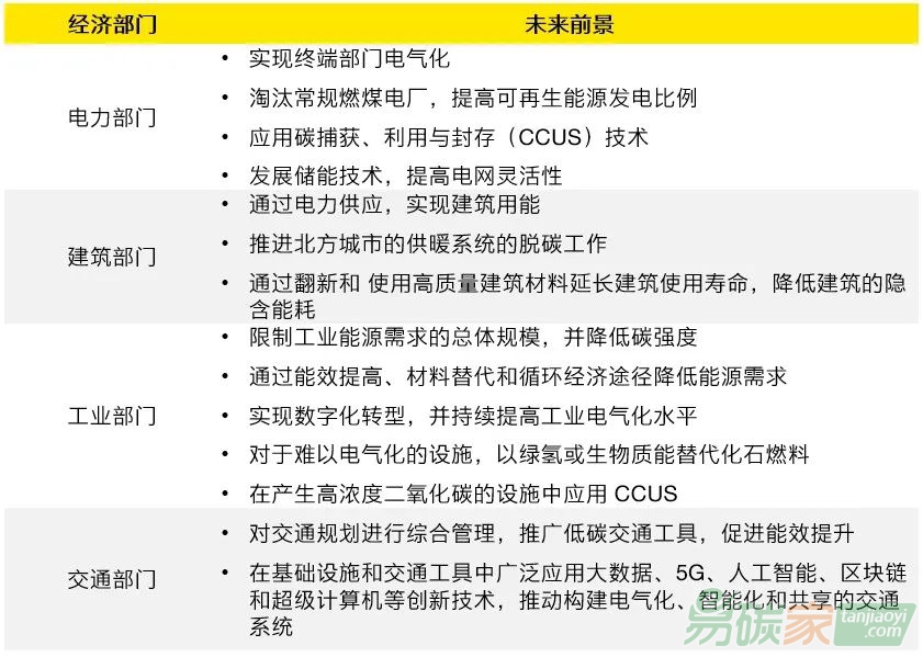 碳排放交易體系的建立對于各經(jīng)濟(jì)部門也帶來了挑戰(zhàn)與機(jī)遇。對于電力及能源密集型行業(yè),提高能效、降低排放是應(yīng)對碳排放交易體系的最基本的應(yīng)對措施,根據(jù)能源基金會《中國碳中和綜合報(bào)告2020》,電力、建筑、工業(yè)、交通等四個經(jīng)濟(jì)部門可以通過以下途徑實(shí)現(xiàn)能效提高和降低排放。