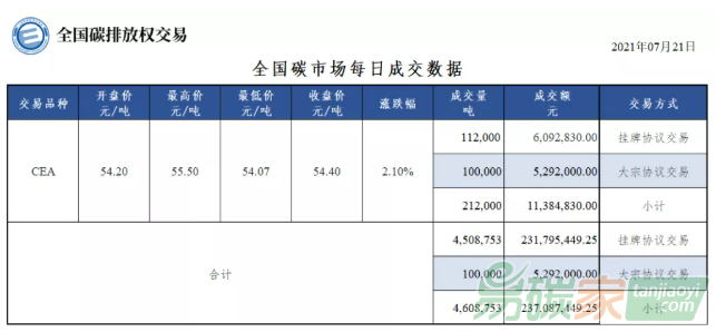 碳市場碳排放配額(CEA)累計(jì)成交量4,608,753噸,累計(jì)成交額237,087,449.25元。