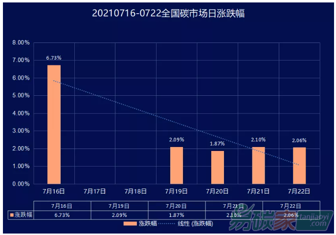 2021年7月16日—7月22日全國碳市場日漲跌幅及走勢