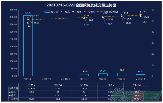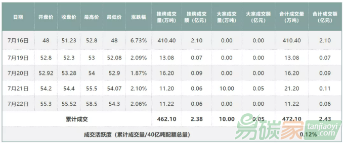 2021年7月16日—7月22日全國碳市場日交易開盤、收盤、盤高、盤低價