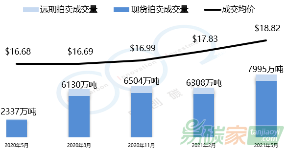 加州-魁北克碳市場的初始配額發(fā)放以拍賣為主,每個(gè)季度舉行一次拍賣。2021年5月的第27次拍賣均價(jià)與總成交量創(chuàng)歷史新高。拍賣均價(jià)為18.82美元,較上一季度漲幅為5.6%,總成交量為7995萬噸。以下是由中創(chuàng)碳投統(tǒng)計(jì)的加州-魁北克碳市場近一年的交易情況。