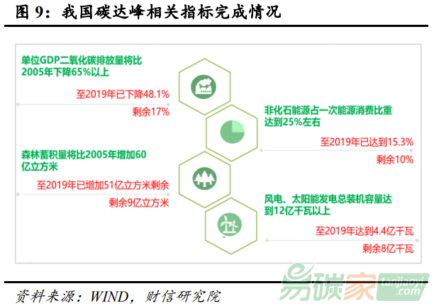 排放權、構建碳排放權的交易市場進行定價至關重要。目前,歐盟、美、日、韓、澳大利亞、巴西等都提出了“碳達峰碳中和”,并均完成了碳達峰。相比他們,在碳中和指標上,中國從“碳達峰→碳中和”的時間窗口僅有30年,而其他國家則有40-60年。而且在綠色經(jīng)濟上,中國基礎較為薄弱,面臨經(jīng)濟、產(chǎn)業(yè)、技術、文化等多方面挑戰(zhàn)。在碳達峰指標上,雖然中國分解出到2030年的四項具體目標,但部分細分指標差距仍較大。如風電、太陽能發(fā)電總裝機容量,到2030年要達到12億千瓦以上,但截至2019年底僅有4.4億千瓦時,還剩余8億千瓦。“十四五”規(guī)劃綱要指出,到2025年單位國內(nèi)生產(chǎn)總值二氧化碳排放降低 18%。根據(jù)植信研究院測算,2025-2030年碳排放量要降至約5億噸,2030年以后降至0。然而“十三五”(2015-2020年)期間,我國碳排放增量還在8.5億噸左右。