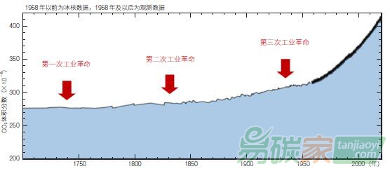 圖1 第一次工業(yè)革命以來全球大氣中CO2 體積分?jǐn)?shù)變化