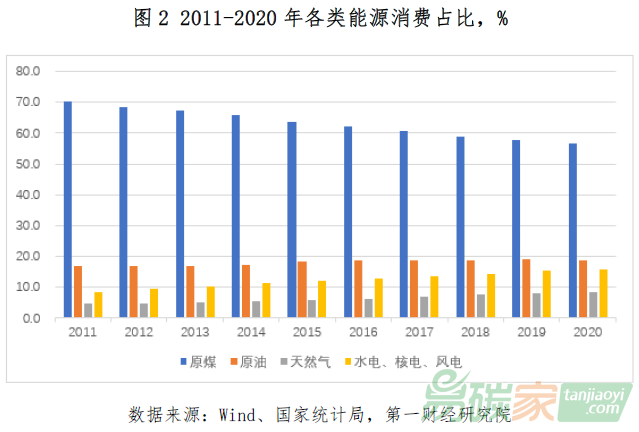 從我國能源消費占比來看,呈現(xiàn)出傳統(tǒng)能源逐步退出的趨勢。根據(jù)國家統(tǒng)計局的數(shù)據(jù),2011至2020年,傳統(tǒng)化石能源占比從91.6%降至84.1%。其中,原煤占比降幅明顯,從70.2%降至56.8%。水電、核電、風電等新能源占比從8.4%上升至15.9%。