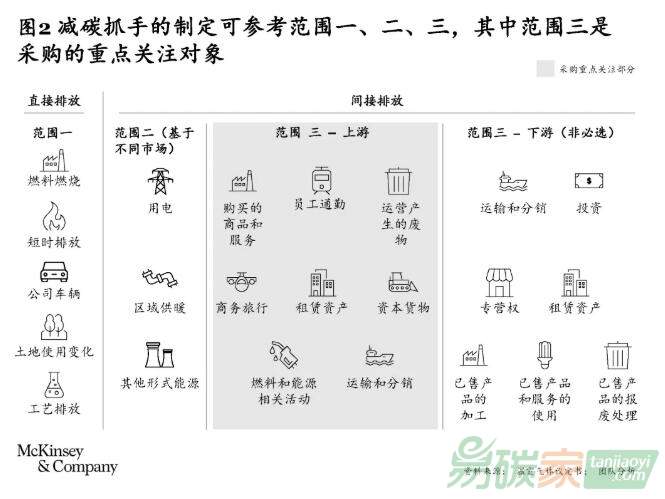 在碳排放的三個(gè)范圍中,采購(gòu)部門應(yīng)重點(diǎn)關(guān)注范圍三,即來(lái)自供應(yīng)鏈上游的碳排放,包括購(gòu)買的零部件、原材料,以及企業(yè)的商旅出行等。