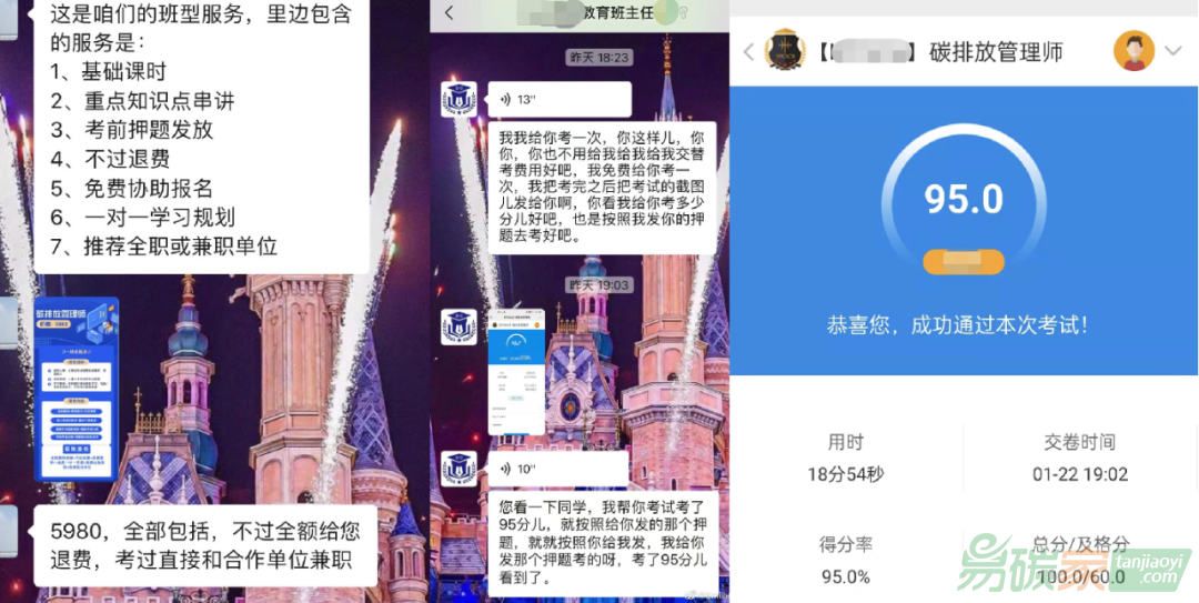 發(fā)現(xiàn)證書(shū)不對(duì)勁,不是所有人都能幸運(yùn)退款。2022年1月,何聰在微博上遇到了同樣在為碳排放培訓(xùn)維權(quán)發(fā)愁的張?chǎng)??!皹I(yè)務(wù)員此前承諾,只要無(wú)法通過(guò)考試,便可以全額退款,”張?chǎng)┍阆胗靡粡埐患案竦木碜訐Q來(lái)退款金。讓她哭笑不得的是,業(yè)務(wù)員擅自背著她用其賬號(hào)信息進(jìn)行了復(fù)試。幾個(gè)小時(shí)后,對(duì)方發(fā)給張?chǎng)┮粡堬@示成績(jī)95分的截圖?!拔乙呀?jīng)幫你考好了,你等著拿證就好了?!?/div>