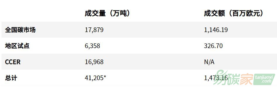 注:*總成交量包括地區(qū)試點ETS、全國碳市場和CCER的配額成交量。成交額僅包括配額單位(由于CCER主要在場外交易,無法公開獲得價格信息)。試點中的碳抵銷交易量較小,不包括在我們的評估中。