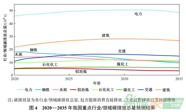 2020-2035年我國重點行業(yè)領(lǐng)域碳排放總量預測結(jié)果。資料來源:《環(huán)境科學研究》