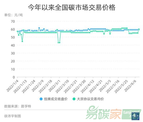 然而,二季度全國(guó)碳市場(chǎng)的交易數(shù)據(jù)更加慘淡。4月、5月,以及6月頭兩周,大多數(shù)交易日的掛牌交易量都只有10噸,4月和5月的大宗交易總量也僅有不足300萬噸;交易價(jià)格則保持在55元—60元/噸之間。