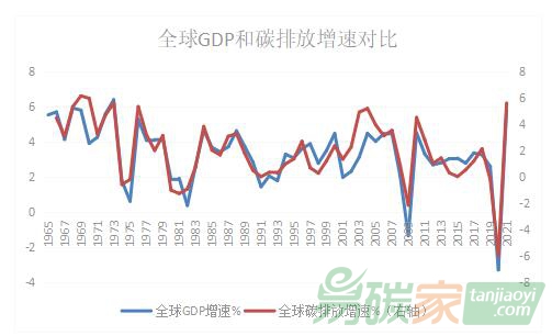 電力、石油等能源的需求,而電力生產(chǎn)、石油、天然氣等化石能源使用都會(huì)產(chǎn)生大量碳排放。例如,從1965年至19世紀(jì)中葉,發(fā)達(dá)國(guó)際的工業(yè)化進(jìn)程推動(dòng)經(jīng)濟(jì)的快速增長(zhǎng),這個(gè)時(shí)期的碳排放總量也呈現(xiàn)快速上升趨勢(shì)。而經(jīng)濟(jì)衰退時(shí)期,能源使用量下滑,碳排放量也同樣出現(xiàn)階段性下滑,例如,20世紀(jì)70年代的兩次石油危機(jī),2008-2009年由美國(guó)次貸危機(jī)引發(fā)的世界經(jīng)濟(jì)危機(jī)、2020年新冠疫情,都帶來(lái)了碳排放總量的零增長(zhǎng)或下降。而在危機(jī)之后的經(jīng)濟(jì)復(fù)蘇中,碳排放則會(huì)出現(xiàn)恢復(fù)性的高增長(zhǎng)。從表2可以看出,2021年七大經(jīng)濟(jì)體的碳排放比2020年都有一定規(guī)模增長(zhǎng)。從圖3也可以看出碳排放的增長(zhǎng)隨經(jīng)濟(jì)增長(zhǎng)波動(dòng)。當(dāng)然,隨著能源結(jié)構(gòu)的調(diào)整,碳排放增長(zhǎng)與經(jīng)濟(jì)增長(zhǎng)的關(guān)系趨向弱化。