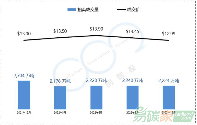 市場(chǎng)的初始配額發(fā)放以拍賣(mài)為主,每個(gè)季度舉行一次拍賣(mài)。2022年第四季度拍賣(mài)成交均價(jià)為12.99美元,較上一季度跌幅為3.42%。RGGI該次拍賣(mài)總成交量為2223萬(wàn)噸,成交比例達(dá)到100%。以下是由中創(chuàng)碳投統(tǒng)計(jì)的RGGI近一年的交易情況。