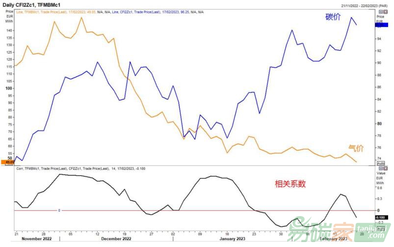 碳配額來套現(xiàn)提高流動性。此外,沖突升級和對于歐洲經(jīng)濟(jì)形勢的擔(dān)憂也使得機(jī)構(gòu)投資者減少對歐元掛鉤資產(chǎn)的敞口,出售碳配額。下圖顯示了近期內(nèi)碳價(jià)和氣價(jià)的走勢以及相關(guān)系數(shù),近期內(nèi)跌落至負(fù)值。這反映了,氣價(jià)下跌,使得企業(yè)或者投資機(jī)構(gòu)獲得了多余的資金,可以來采購碳配額,推高了碳價(jià),二者負(fù)相關(guān)。這也反映了近期氣價(jià)暴跌,碳價(jià)上漲,主要還是碳
