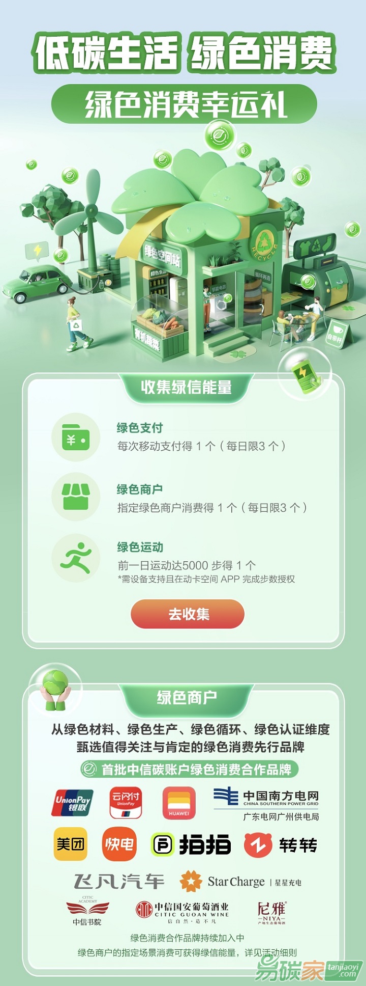 7月12日是“全國低碳日”,今年主題為“積極應(yīng)對氣候變化,推動綠色低碳發(fā)展”。在此之際,中信銀行信用卡邀請飛凡汽車、廣東電網(wǎng)廣州供電局、快電、美團、拍拍、星星充電、轉(zhuǎn)轉(zhuǎn)、中信國安葡萄酒業(yè)8家企業(yè)加入成為“綠·信·匯”生態(tài)平臺新成員,與平臺現(xiàn)有成員伙伴中國銀聯(lián)-云閃付APP、華為錢包、中信書院一同,基于“中信碳賬戶”平臺推出全新綠色消費體系,旨在發(fā)揮低碳生態(tài)平臺的聯(lián)盟力量,聯(lián)合各行各業(yè)開拓綠色場景,持續(xù)推動綠色金融創(chuàng)新。截至目前,“中信碳賬戶”注冊用戶數(shù)已超過500萬,正吸引越來越多的用戶加入綠色行動,踐行低碳生活。
