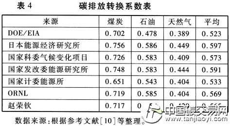 這種方法雖然比方法1復(fù)雜,但可以大致分清固體、氣體、液體燃料的排放量,目前應(yīng)用也比較多。不過,運(yùn)用這種方法得出的二氧化碳排放量比運(yùn)用其他方法得出的排放量會嚴(yán)重偏低,之所以如此,主要原因有兩個:一是如表4所示,碳轉(zhuǎn)換系數(shù)的平均值在0.5-0.6之間,低于方法1中的EFst值;二是燃料的核算范圍被限定為煤炭、石油、天然氣,而一些難以歸類到這三種能源之間的燃料品種很容易被漏算,如焦?fàn)t煤氣、進(jìn)口或市外調(diào)入的焦炭產(chǎn)品等。