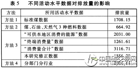 通過表5可以看出,不同的活動水平數(shù)據(jù)選取對城市能源消費(fèi)二氧化碳排放量有著較大的影響,其中最高值與最低值之間相差高達(dá)2400多萬噸。方法2數(shù)值偏低,前文已經(jīng)作了解釋,主要在于碳轉(zhuǎn)換系數(shù)值較低和燃料核算范圍未包括全部品種;“消費(fèi)量合計”數(shù)據(jù)得到的排放量偏高的原因主要在于所有能源加工轉(zhuǎn)換過程中的燃料消耗都被核算在內(nèi)。其他數(shù)據(jù)之間產(chǎn)生差異的原因如下:是否考慮了能源加工轉(zhuǎn)換過程中的燃料消費(fèi);“原煤入洗”、“煉焦”所消耗的能源是否納入了核算。此外,方法4排放量與其他方法排放量的差異還在于方法4使用了分行業(yè)的排放因子。