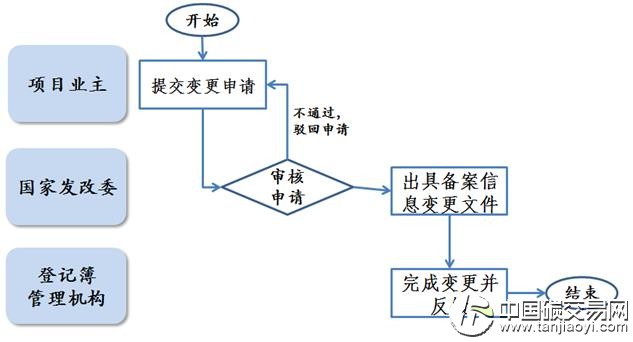 當自愿減排備案項目信息發(fā)生變化時,項目業(yè)主根據(jù)相關(guān)規(guī)定向國家發(fā)展改革委氣候司提交備案項目信息變更申請。氣候司審核通過后,登記簿管理機構(gòu)完成相關(guān)信息變更。