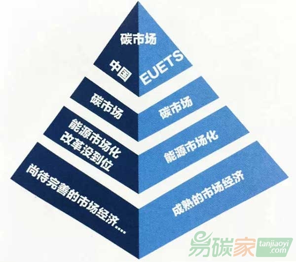 而中國經(jīng)過三十多年的改革開放,市場經(jīng)濟(jì)體制初步建立,但還不完善,尤其是能源領(lǐng)域的市場化改革遠(yuǎn)沒有到位,一些能源品種的價(jià)格,比如電價(jià)等還完全不是市場決定的,碳排放成本將無法通過能源價(jià)格進(jìn)行傳導(dǎo),碳市場的基礎(chǔ)不夠穩(wěn)固,是一個(gè)不太穩(wěn)定的“金字塔”(如上圖所示),國內(nèi)外的一些學(xué)者研究也表明,如果電力等能源品種的商品屬性得不到充分尊重,價(jià)格長期無法實(shí)現(xiàn)市場化,那么碳市場運(yùn)行的效率都將打折扣,無法保障以最低的成本實(shí)現(xiàn)對碳排放量的有效控制,最終從長遠(yuǎn)看來不利于國家碳排放峰值目標(biāo)的實(shí)現(xiàn)以及經(jīng)濟(jì)結(jié)構(gòu)的轉(zhuǎn)型。