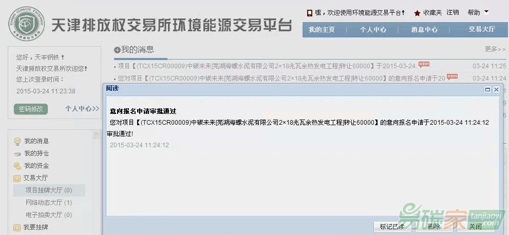 2015年3月24日,天津天豐鋼鐵有限公司與中碳未來(北京)資產(chǎn)管理有限公司在天津排放權(quán)交易所交易平臺(tái)完成了6萬噸國(guó)內(nèi)首筆控排企業(yè)購(gòu)買中國(guó)核證自愿減排量(以下簡(jiǎn)稱ccer)線上交易。交易項(xiàng)目系蕪湖海螺水泥有限公司余熱發(fā)電工程項(xiàng)目(備案編號(hào):041)。