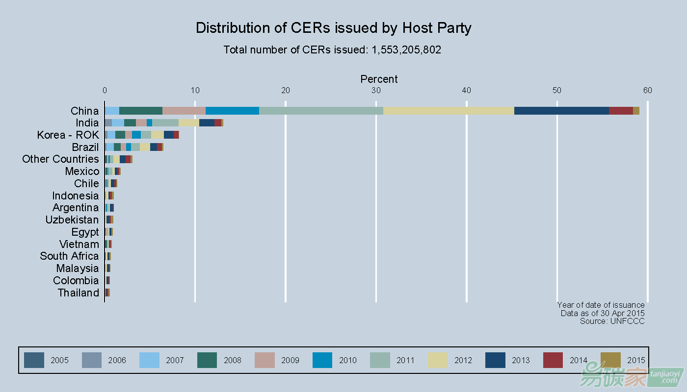 截至2015年04月30日,我國獲得CERs簽發(fā)的CDM項(xiàng)目