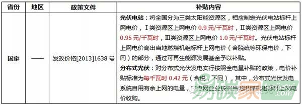 2013年8月,國家發(fā)改委發(fā)布《關(guān)于發(fā)揮價格杠桿作用促進光伏產(chǎn)業(yè)健康發(fā)展的通知》(發(fā)改價格[2013]1638號),明確分布式光伏發(fā)電項目的補貼標準為0.42元/千瓦(含稅)。
