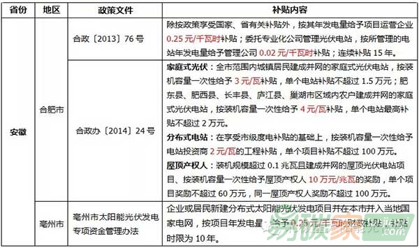 合肥市對光伏項目的補貼,有度電補貼的形式,但更多的是以初始投資補貼為主。在現(xiàn)有的投資水平下,初始投資的補貼力度還是很大的。毫州市的雖然沒有找到文件原文,但是在財政部網(wǎng)站有發(fā)布相關(guān)內(nèi)容,所以補貼信息還是靠譜的!
