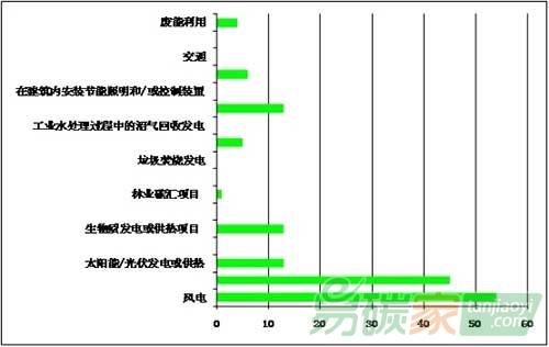 就項目類型而言,風水光占居前三甲。其中:風電54個,水電45個,光伏發(fā)電13個。生物質(zhì)發(fā)電和農(nóng)村戶用沼氣與光伏發(fā)電項目數(shù)量相同,也位居第三名(見下圖)。