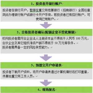 (一)投資者在銀行開戶,暫限在重交所結(jié)算銀行(招商銀行)全國任意網(wǎng)點(diǎn)辦理銀行賬戶或銀行卡開戶手續(xù)。新開招商銀行賬戶達(dá)正??捎脿顟B(tài)大概需5個(gè)工作日,因此可同步開始重交所碳排放賬戶開戶流程。若機(jī)構(gòu)投資者已 ...