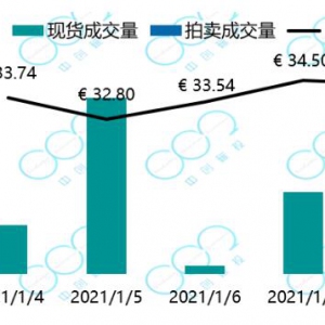 01歐盟碳市場2021年1月4日至1月8日,歐盟碳價(jià)上漲至34.3歐元每噸,盤中一度達(dá)到過35歐元每噸。2021年的配額拍賣將從1月底開始,今年計(jì)劃拍賣總量為5.83億噸,相比去年的6.76億噸,減少了14%。02韓國碳市場2021年1月4 ... ...