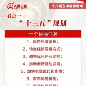 人民日報官方微博公布“十三五”規(guī)劃的十個任務(wù)目標:1、保持經(jīng)濟增長,2、轉(zhuǎn)變經(jīng)濟發(fā)展方式,3、調(diào)整優(yōu)化產(chǎn)業(yè)結(jié)構(gòu),4、推動創(chuàng)新驅(qū)動發(fā)展,5、加快農(nóng)業(yè)現(xiàn)代化步伐,6、改革體制機制,7、推動協(xié)調(diào)發(fā)展,8、加強生態(tài)文 ...